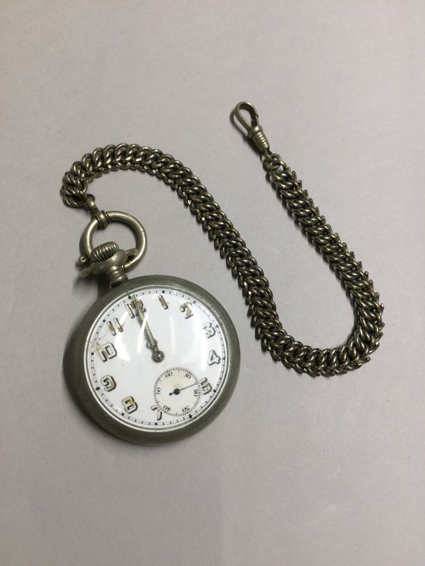 Horloge aan ketting met onedel metalen kast met deksel waarop merkje aan binnenzijde