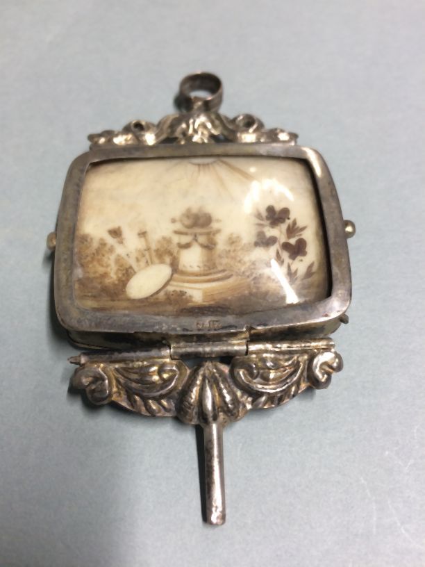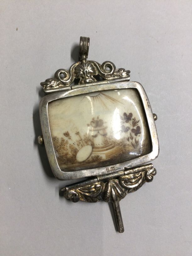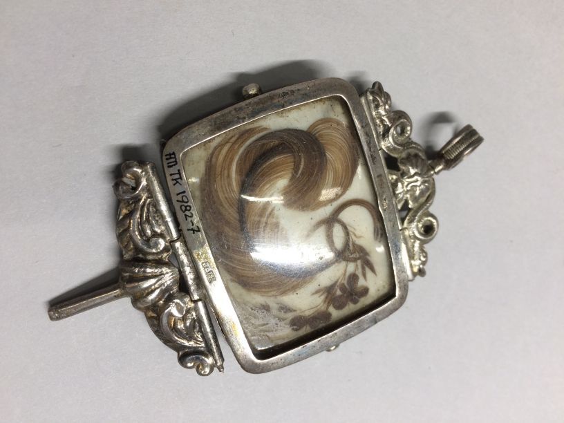 Horlogesleutel met achter vierkant glas aan beide zijde versiering van o.a. haarwerk