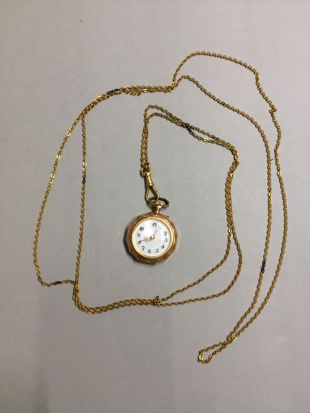 Dameshorloge in gouden kast met een twaalfhoekige omtrek