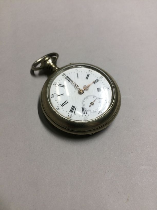 Herenhorloge in een ronde zilverkleurige kast met wit geëmailleerde wijzerplaat