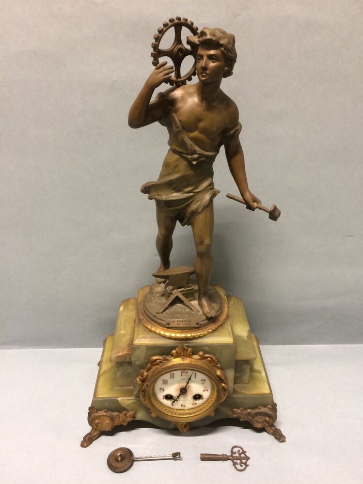 Franse met groen beklede schoorsteenklok waarop beeldje Le Travail