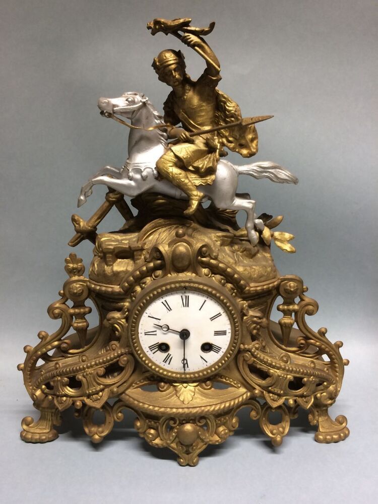 Gegoten metalen pendule met ronde witte wijzerplaat met bovenop een antieke krijger te paard