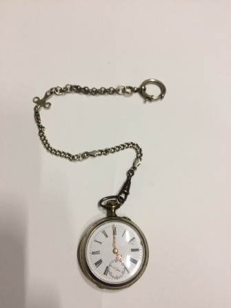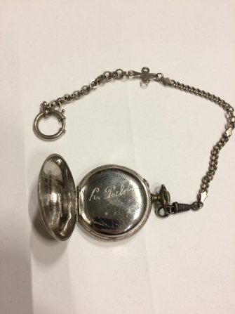 Zakhorloge met op de achterzijde een afbeelding van een paard in de wei, aan Berlijns zilveren horlogeketting, in de binnenkast gegraveerd L. Poelstra