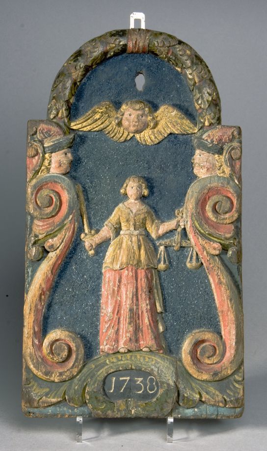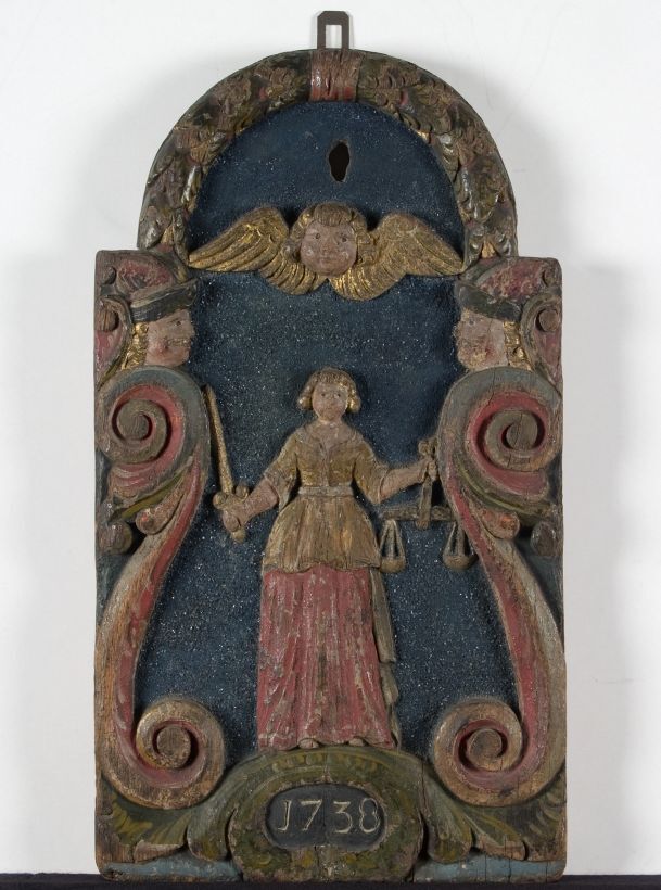Mastplank met voorstelling van Gerechtigheid en jaartal 1738