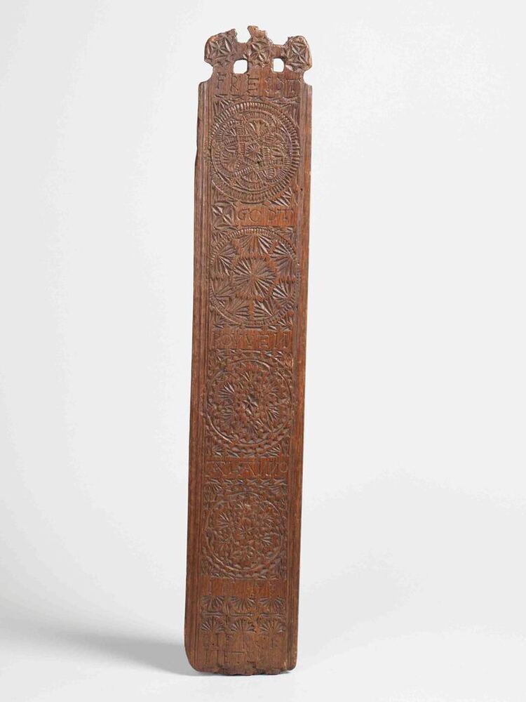 Mangelplank versierd met kerfsnijwerk en de naam Sierck Pieter