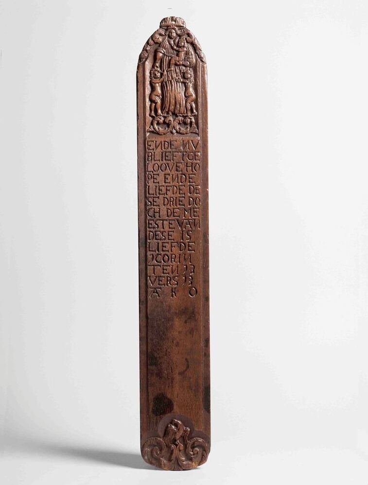 Mangelplank met aan de top een gesneden voorstelling van een vrouw met drie kinderen en met opschrift
