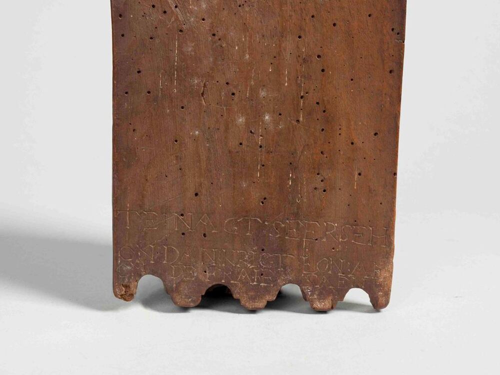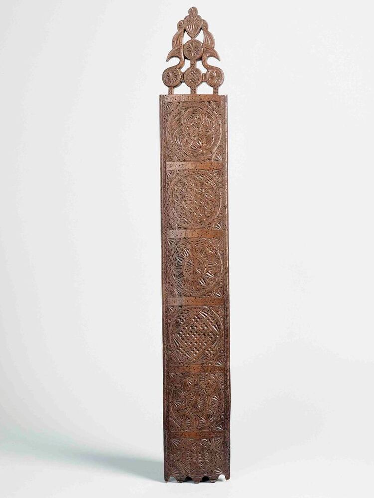 Mangelplank waarvan de top ajour is opgebouwd uit drie ronde schijven waarboven een ronde schijf en links en rechts een zwanehals