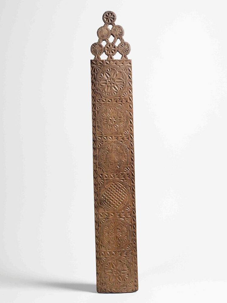 Mangelplank, versierd in kerfsneetechniek met zes cirkels waarin verschillende patronen