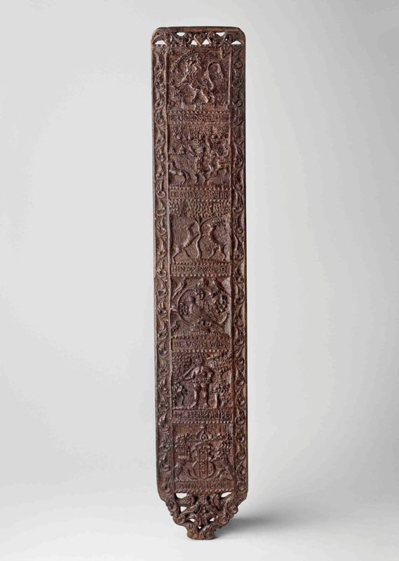 Zeer fraai besneden licht gewelfde mangelplank met diverse afbeeldingen