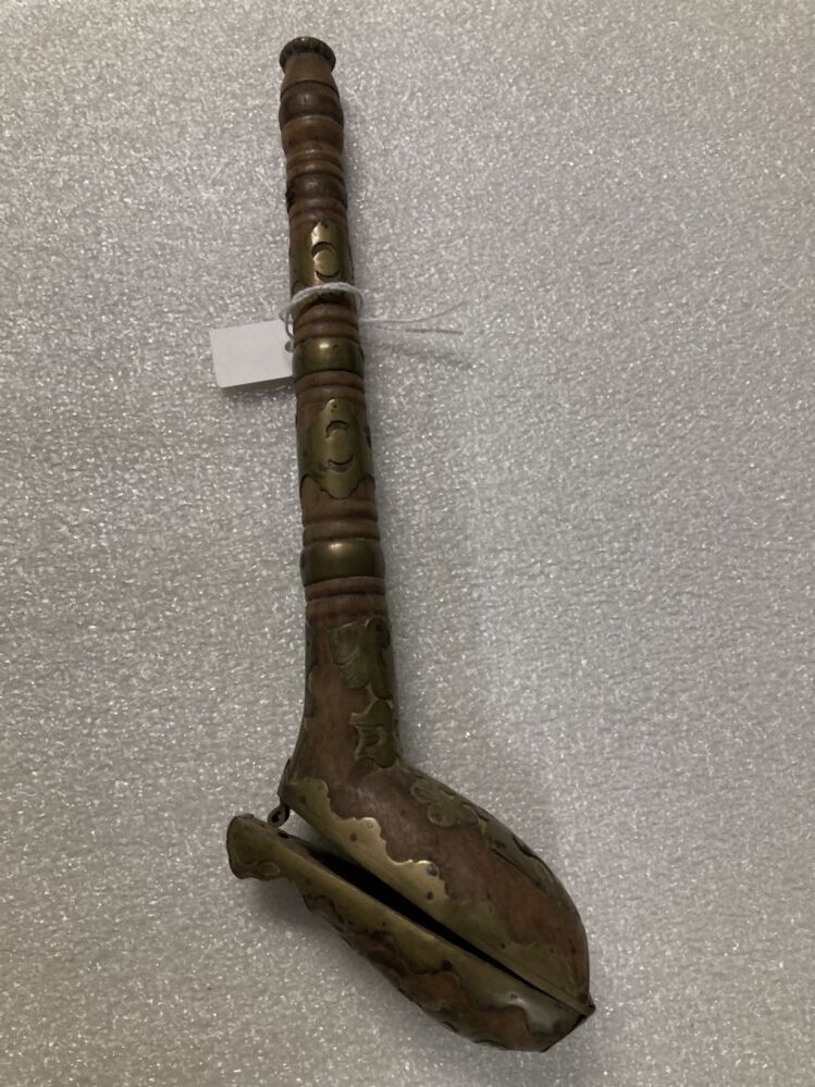 Pijpvormig foudraal met in tweeën scharnierende kop messingversiering in de vorm van een gestileerde bloem