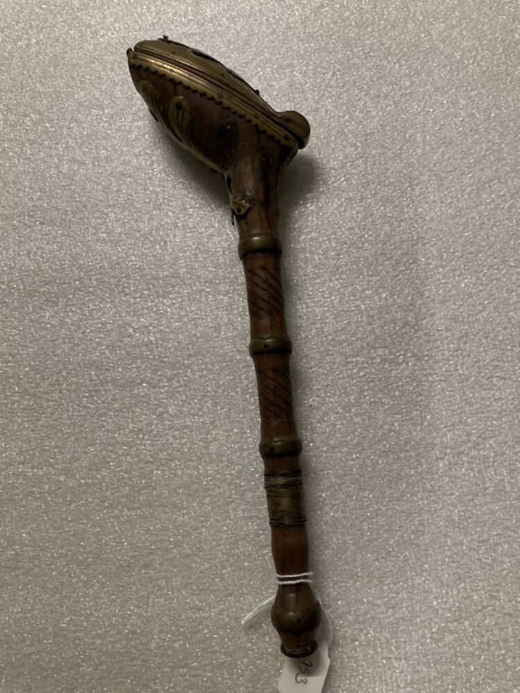 Pijpvormig foudraal met in tweeën scharnierende kop die is beslagen met een messing levensboom