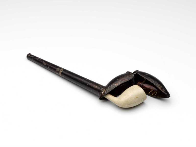 Pijp met roemervormige kop, verbonden aan een dunne steel waarop staat biscuit pipe en Berwick