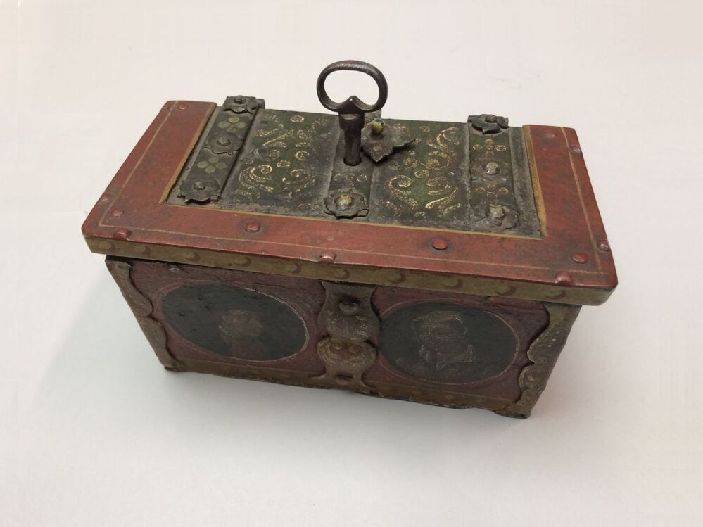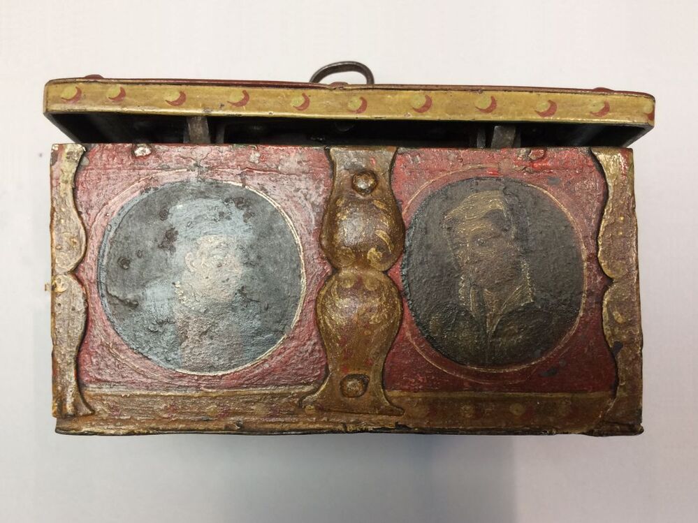 IJzeren trouwkistje met fraai slotwerk en portretten van echtpaar