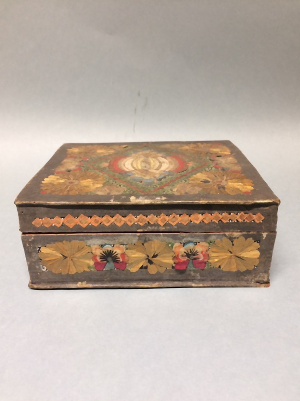 Werkkistje van hout met opgelegde bloemen en figuren van zijde en stro