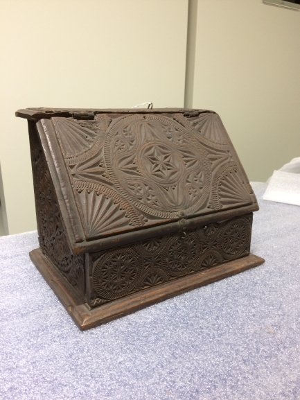 Lessenaarvormig kistje met kerfsneeversiering, afkomstig van Ameland