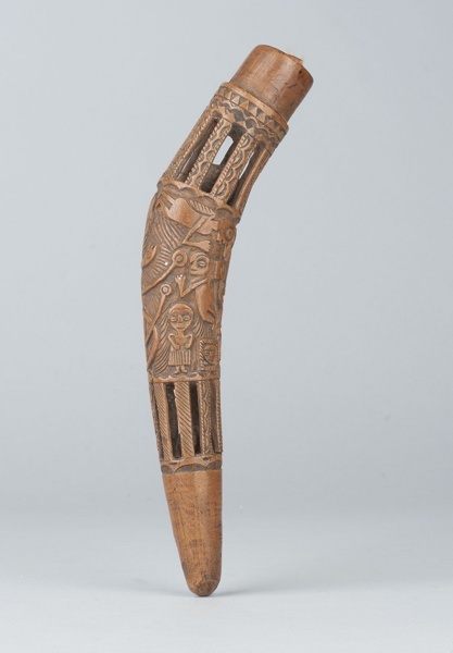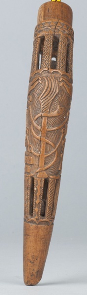 Gebogen breischede van hout met op twee plaatsen een balletje dat kan bewegen