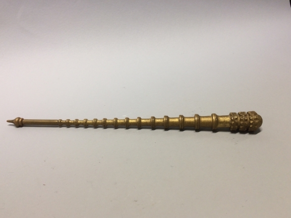 Verguld houten masttop, met onderaan drie bredere, dicht bijelkaar zittende ringen met uithollingen en bovenaan een glad stukje met een peervormige punt.