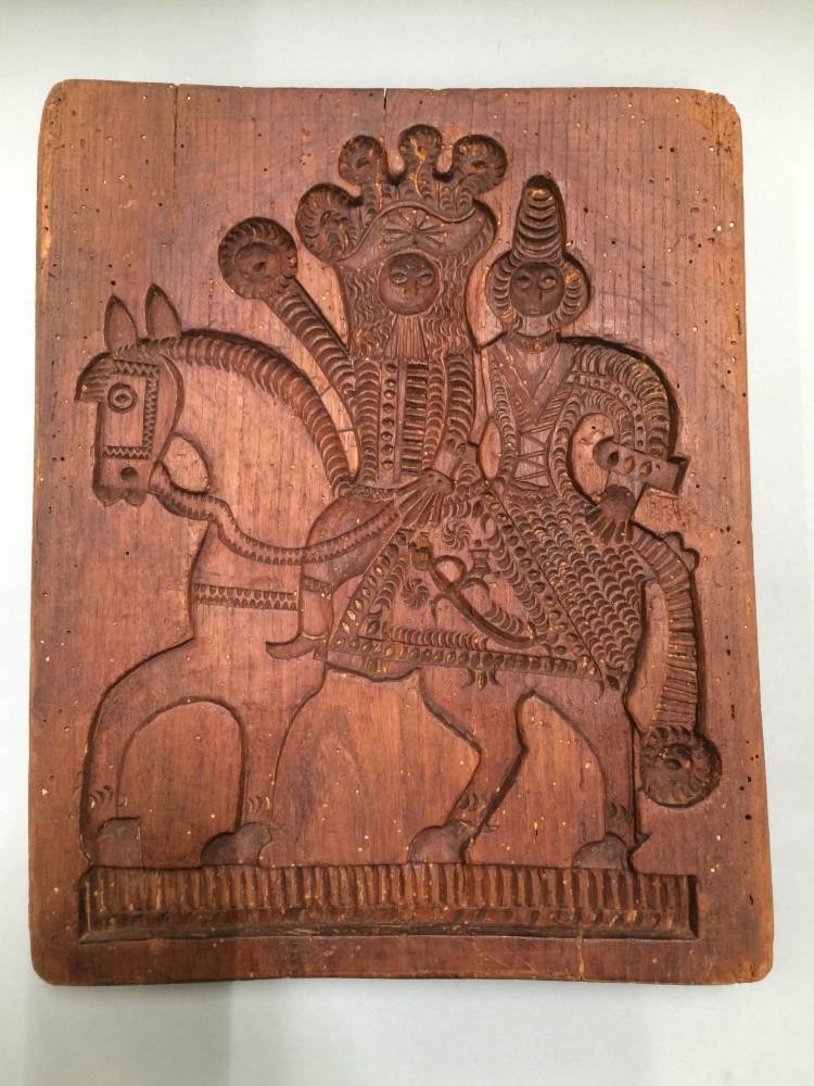 Tweezijdig besneden plank op de ene kant een heer en dame in 18e eeuwse kostuum op een paard gezeten, op de andere kant een koe