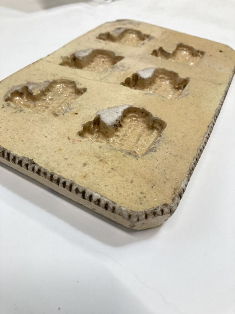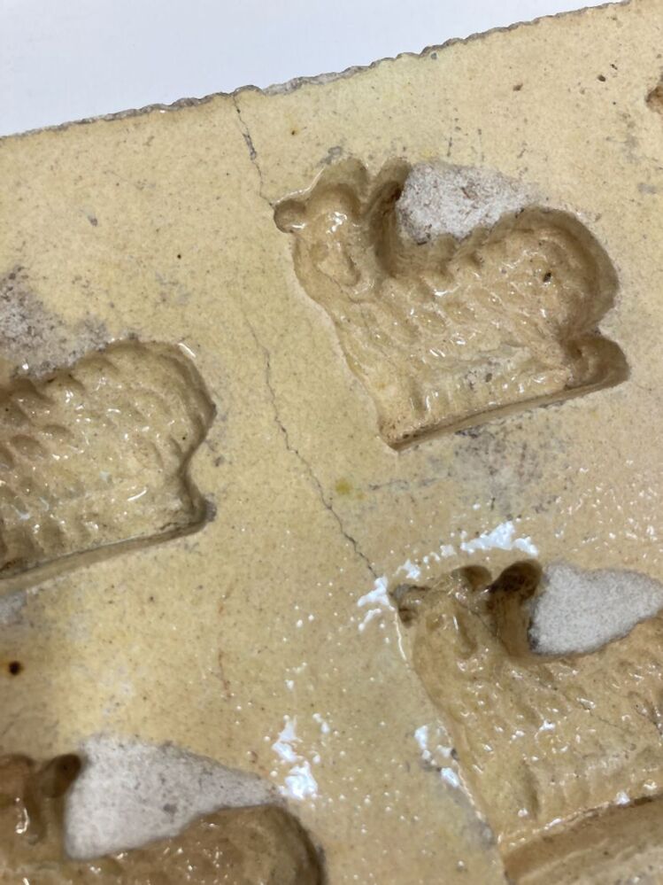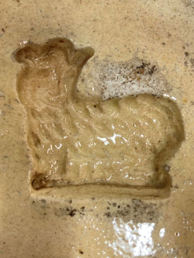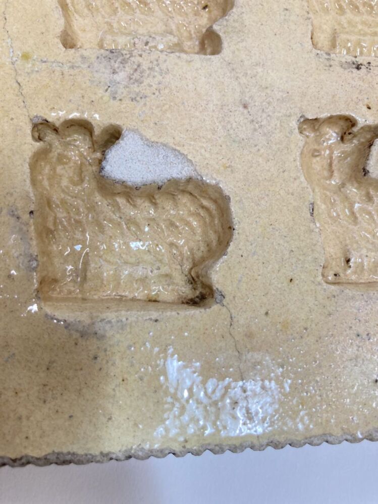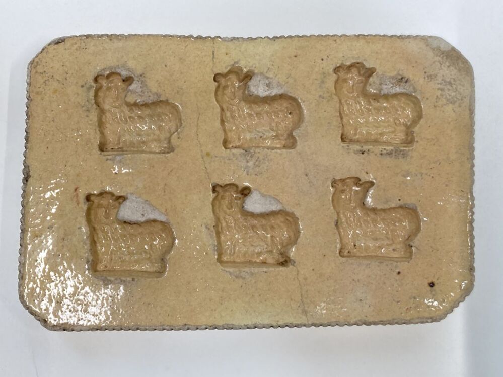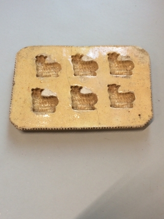 Bakvorm met figuur van een schaap, onderdeel van acht bakvormen van geel verglaasde gebakken aarde