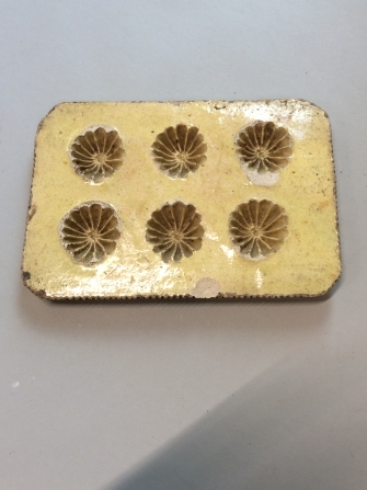 Bakvorm met figuur van een bloem, onderdeel van acht bakvormen van geel verglaasde gebakken aarde