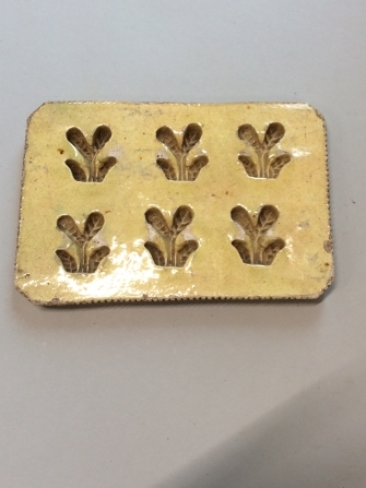 Bakvorm met figuur van een bloem, onderdeel van acht bakvormen van geel verglaasde gebakken aarde