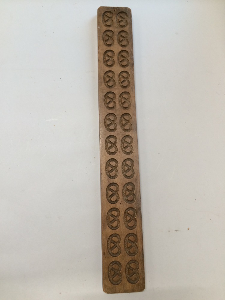 Tweezijdig besneden speculaasplank met op een kant twaalf rijen van twee krakelingen