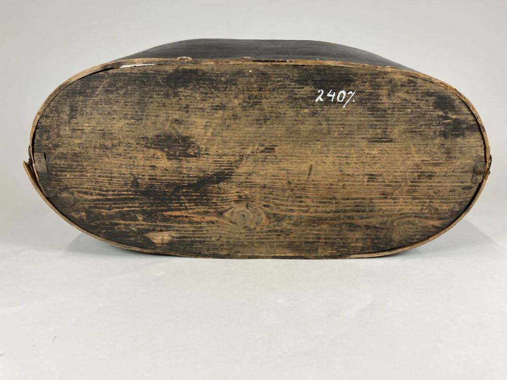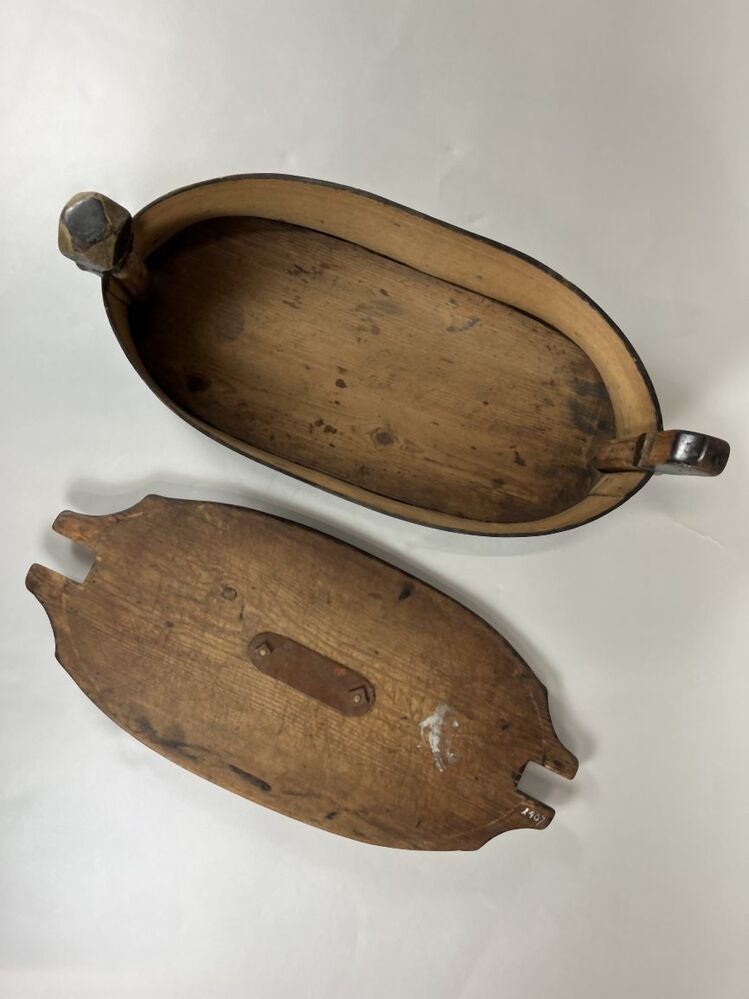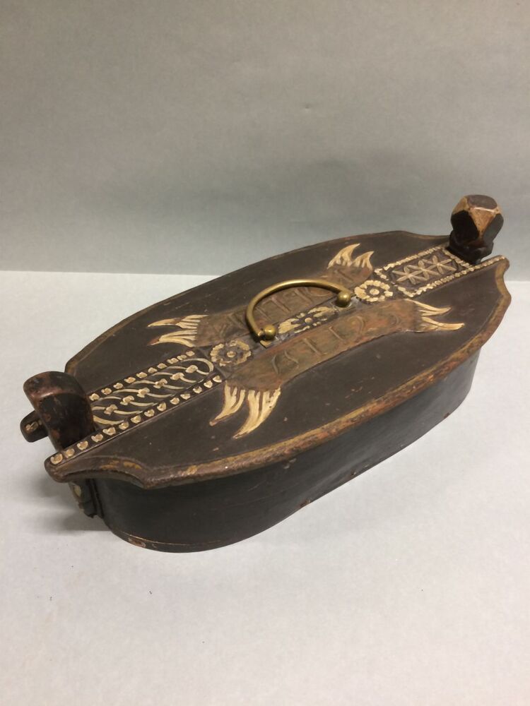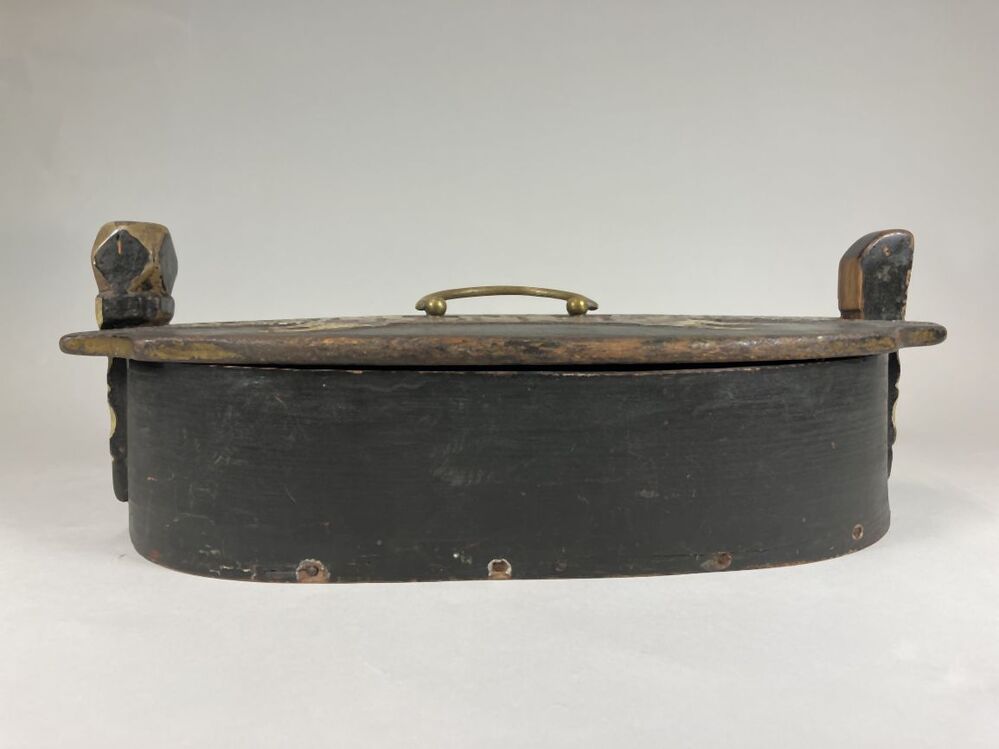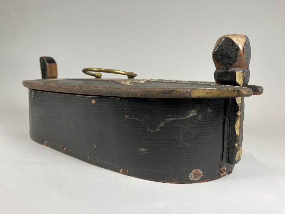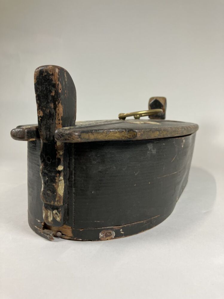 Spanen doos met koperen hengsel en deksel met opschrift