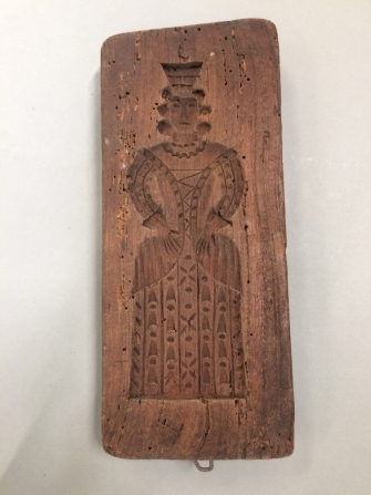 Koekplankje van iepenhout met op de ene kant een trommelslager, op de ander kant een vrouw, initialen H.S.