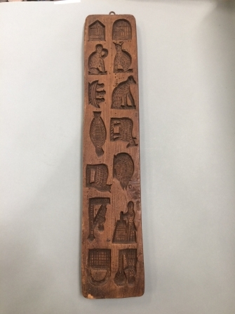 Speculaasplank aan twee zijden besneden met figuurtjes als vogelkooitje, kat, aapje en dergelijke