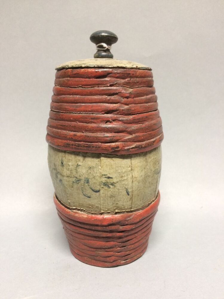 Vaatje met deksel voorzien van een bruine knop behorend bij klein beschilderd houten tobbetje