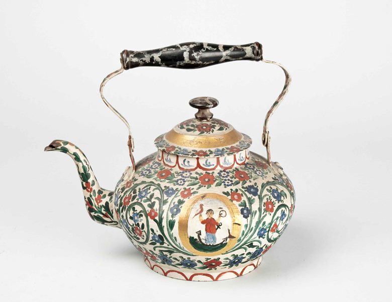 Koperen keteltje met tuit en houten hengsel, van buiten wit geschilderd met medaillons met Hoop en Gerechtigheid en bloemversiering