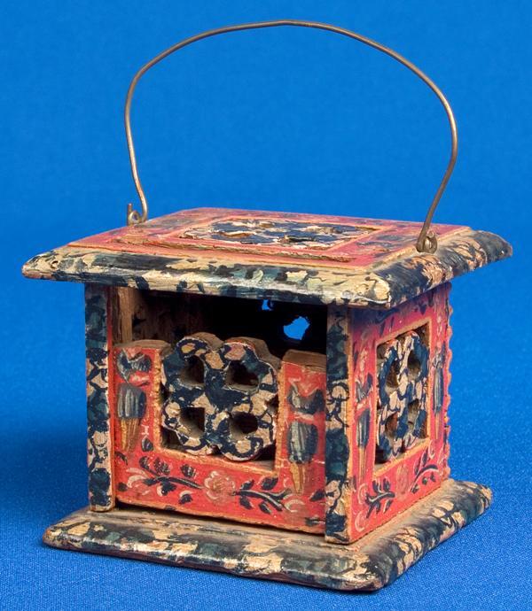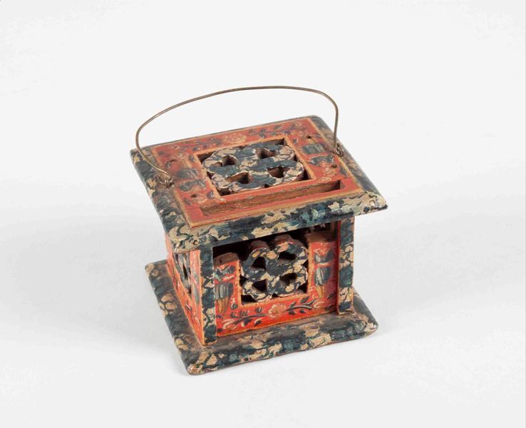 Miniatuur stoof met koperen hengsel en bloemen en figuren