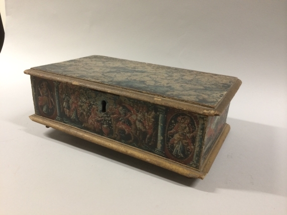 Kistje met deksel versierd met geschilderde voorstellingen en het jaartal 1768, op pootjes