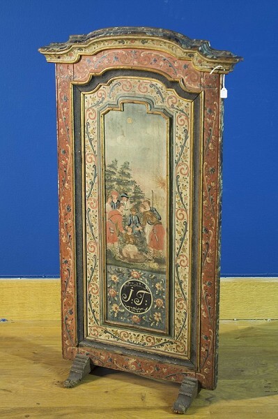 Beschilderd vuurscherm met in het midden een voorstelling van een zeeman en aan de andere zijde een bijbelse voorstelling uit Genesis