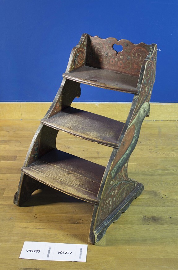 Typisch Hindelooper huisraad; in Hindeloopen waren de bedsteden zo hoog dat een trapje nodig was om in de bedstee te kunnen komen; in andere plaatsen rond de Zuiderzee was een beddebankje hoog genoeg. https://data.cultureelerfgoed.nl/term/id/cht/d2370cd2-c9fd-4be9-a1c2-41ddc5f54426