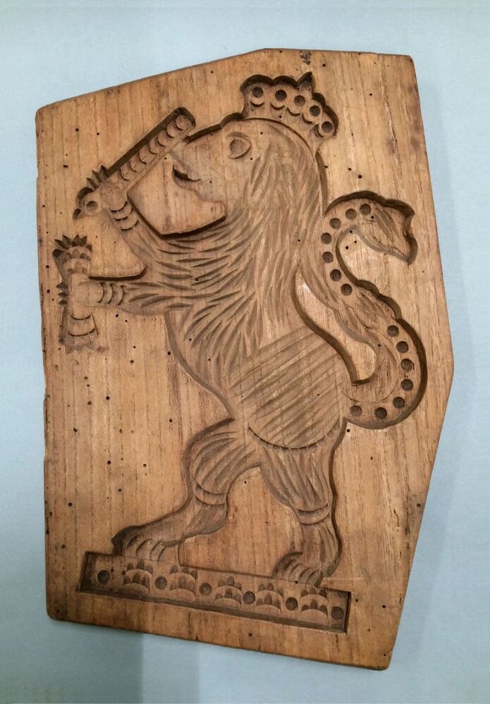 Koekplank waarvan twee zijden enigszins dakvormig zijn gezaagd, eenzijdig besneden met de Hollandse leeuw