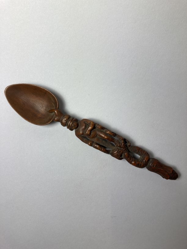 Lepel met het hoofd van een naakte mannenfiguur, die staat op een lusvormige geruwde tak met gestileerd lofwerk