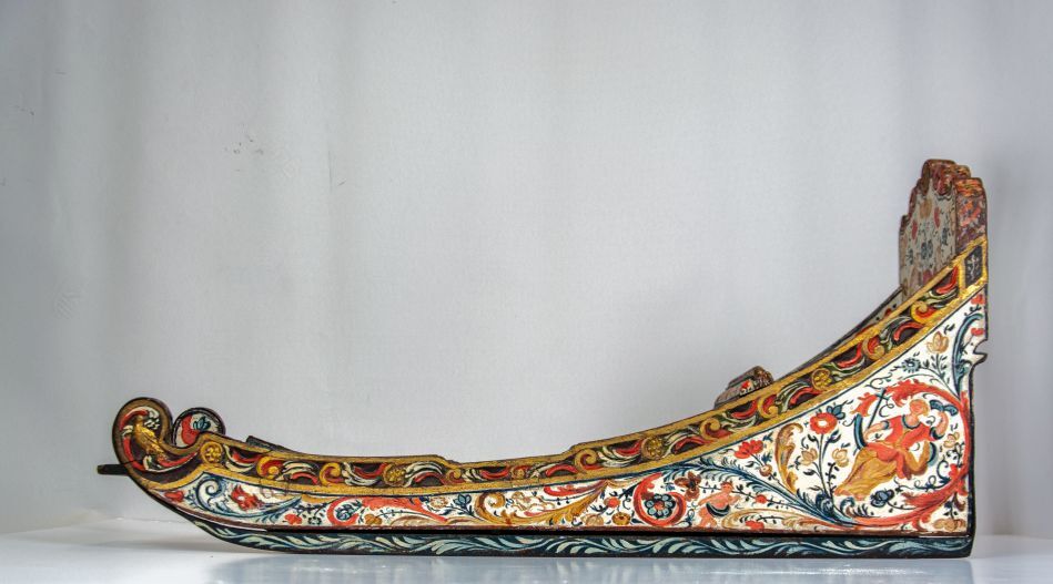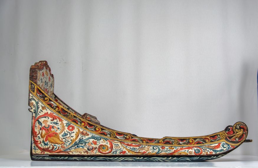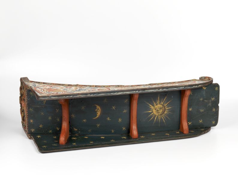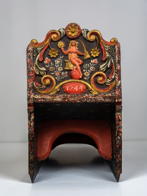 Prikslee van hout, versierd met snijwerk met op achterblad naakte vrouwfiguur