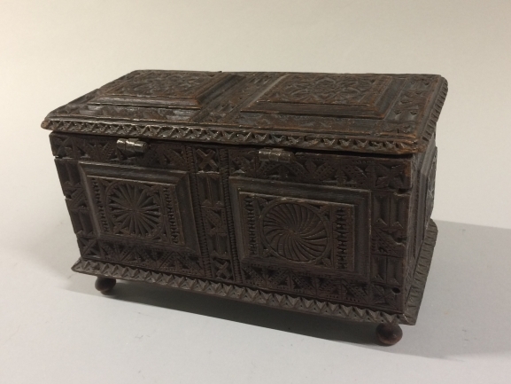 Langwerpig rechthoekig kistje op houten bolpootjes met scharnierend deksel, versierd met kerfsneewerk