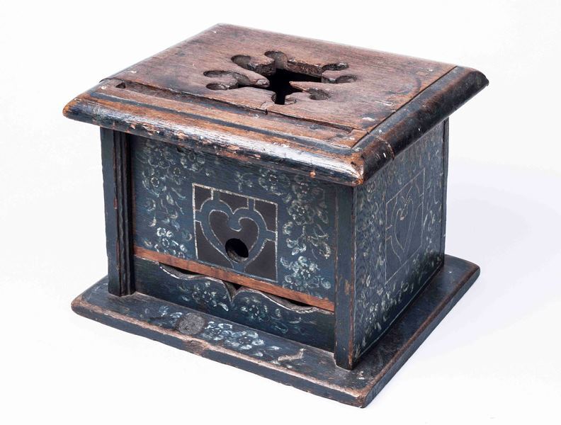 Hindelooper stoof waarop bloemen en hartmotief in blauw met wit