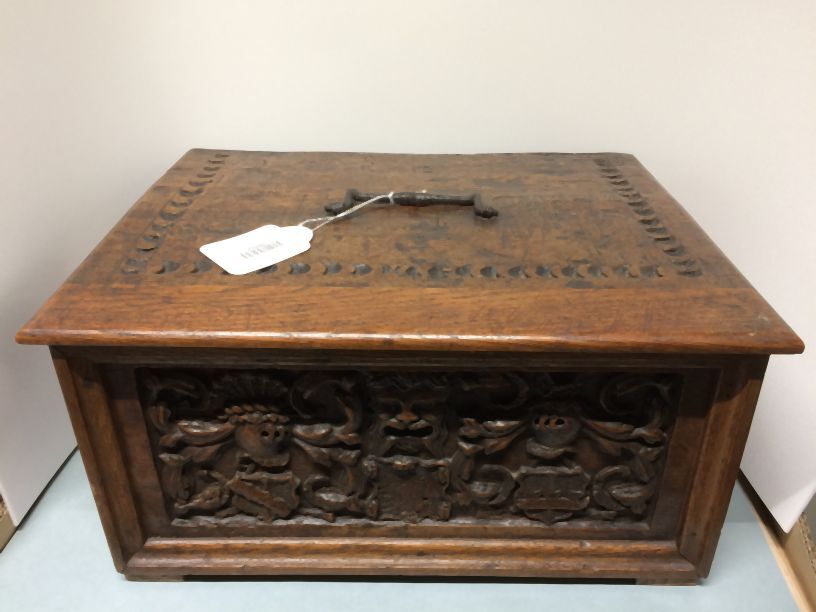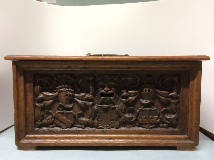 Langwerpig vierkant kistje met drie wapenschilden op de voorkant