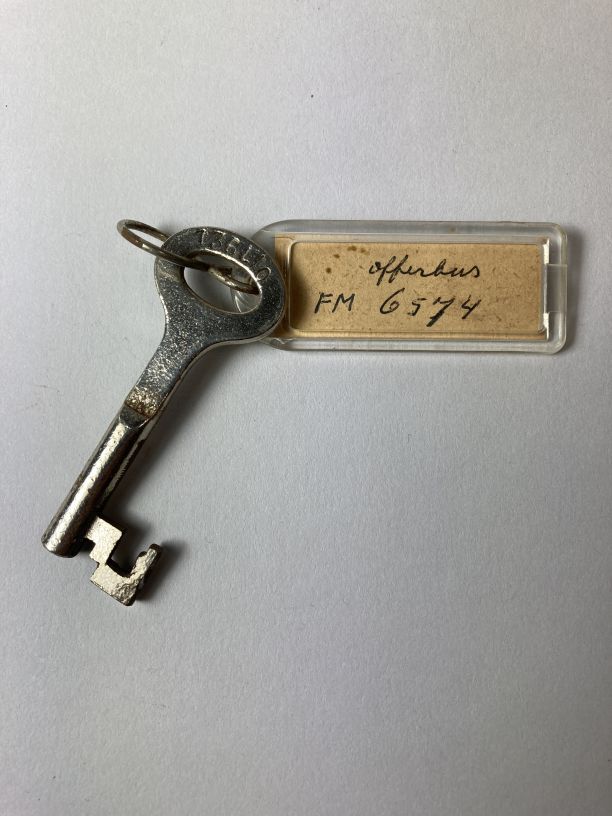 Sleutel, behorenden bij armenbus met zwaar ijzeren slot en hengsel