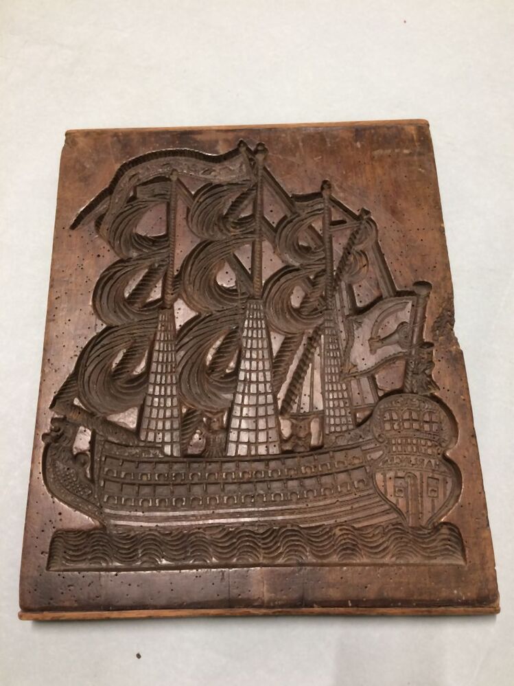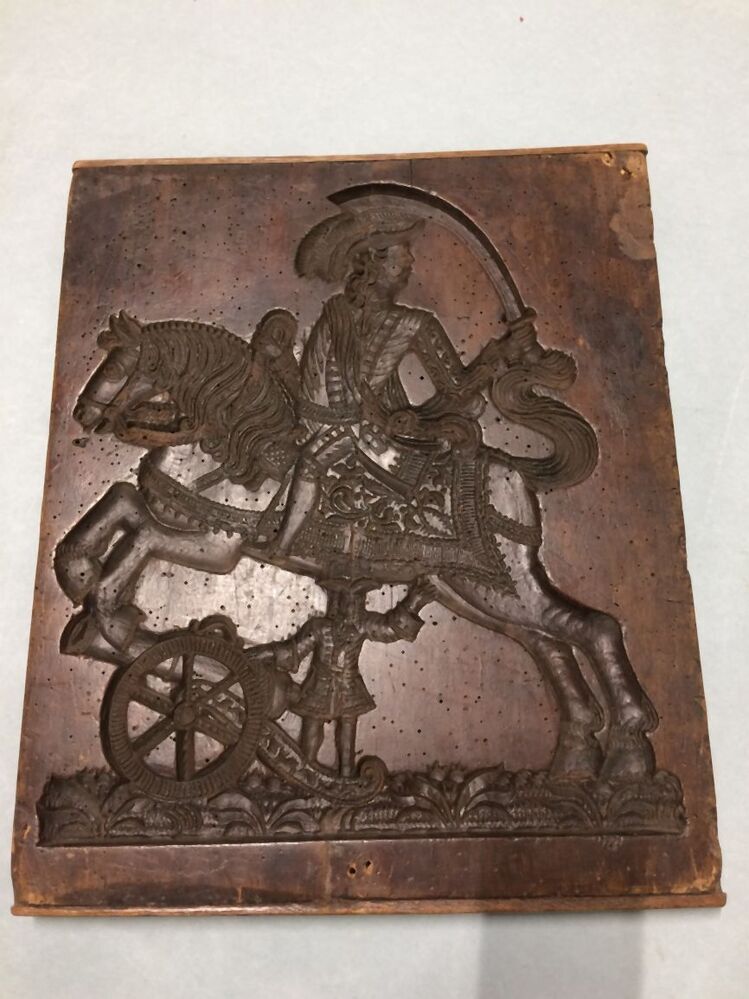 Tweezijdig besneden koekplank, waarop een driemast oorlogsschip en een ruiter met kromzwaard