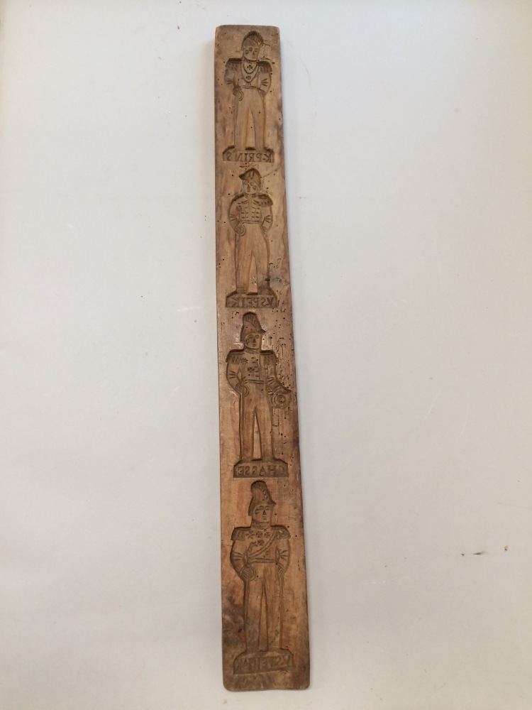 Eenzijdig besneden koekplank, vier officieren ten voeten uit, met onderschriften in spiegelbeeld
