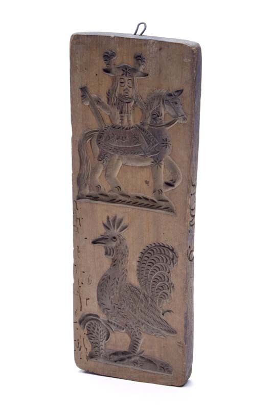 Koekplank waarop een ruiter in 18e eeuwse dracht en een haan, ingesneden T:W.=9