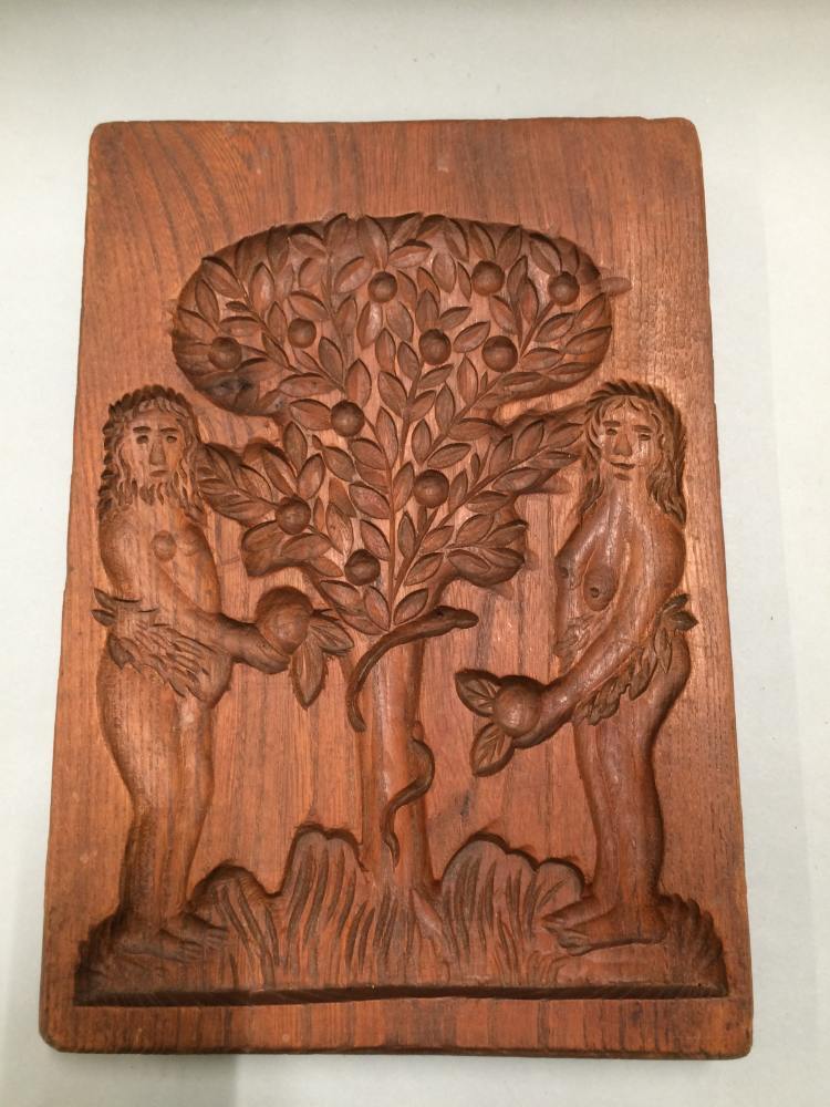 Tweezijdig besneden koekplank met Adam en Eva bij de boom met de slang en een boer met schop