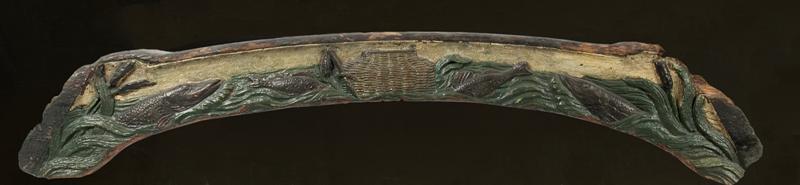 Stuk snijwerk, versierd met in het water zwemmende vissen van tenen vlechtwerk