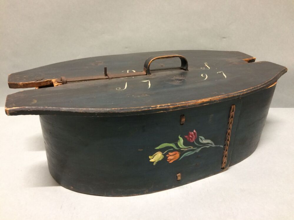 Pruisisch-blauw geverfde vurenhouten budde of opbergdoos, beschilderd met tulpen en rozen, met deksel waarop PS 1797
