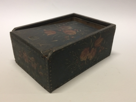 Vierkant houten kistje met schuifdeksel donkerblauw beschilderd met gekleurde bloemboeketjes