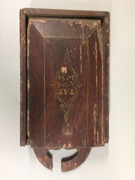 Bruin geverfd eikenhouten schoolbord met op het schuifdeksel T.A.T. 1854
